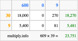 That's all there is to it! As you can see from the box above, the answer to 609 times 39 using the box method is 23,751.