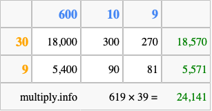 Below is an illustration showing you how to calculate 619 times 39 using the box method, using the instructions above.