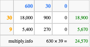 That's all there is to it! As you can see from the box above, the answer to 630 times 39 using the box method is 24,570.
