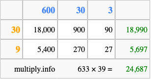 That's all there is to it! As you can see from the box above, the answer to 633 times 39 using the box method is 24,687.