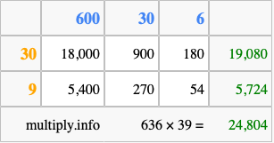 Below is an illustration showing you how to calculate 636 times 39 using the box method, using the instructions above.