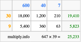 That's all there is to it! As you can see from the box above, the answer to 647 times 39 using the box method is 25,233.