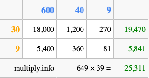 Finally, we add up all the sums we found in step 3 to get our final answer to 649 times 39.