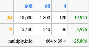 That's all there is to it! As you can see from the box above, the answer to 664 times 39 using the box method is 25,896.