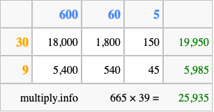 That's all there is to it! As you can see from the box above, the answer to 665 times 39 using the box method is 25,935.