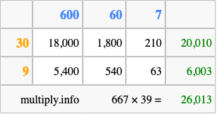 That's all there is to it! As you can see from the box above, the answer to 667 times 39 using the box method is 26,013.