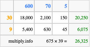 Finally, we add up all the sums we found in step 3 to get our final answer to 675 times 39.
