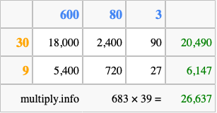 That's all there is to it! As you can see from the box above, the answer to 683 times 39 using the box method is 26,637.