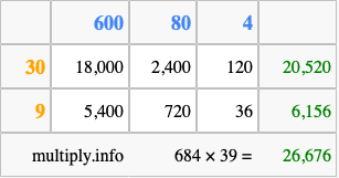 That's all there is to it! As you can see from the box above, the answer to 684 times 39 using the box method is 26,676.