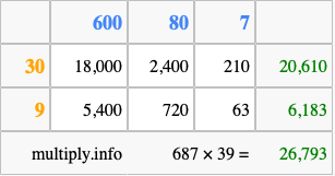That's all there is to it! As you can see from the box above, the answer to 687 times 39 using the box method is 26,793.