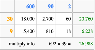That's all there is to it! As you can see from the box above, the answer to 692 times 39 using the box method is 26,988.