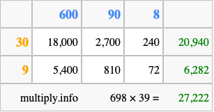 That's all there is to it! As you can see from the box above, the answer to 698 times 39 using the box method is 27,222.