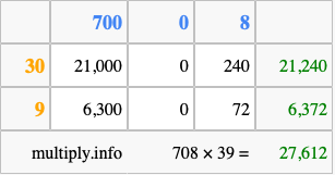 Below is an illustration showing you how to calculate 708 times 39 using the box method, using the instructions above.
