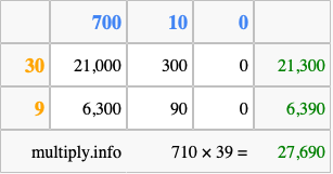 Below is an illustration showing you how to calculate 710 times 39 using the box method, using the instructions above.