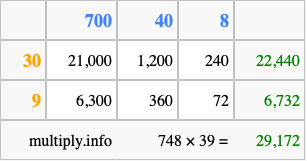 Below is an illustration showing you how to calculate 748 times 39 using the box method, using the instructions above.
