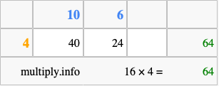 That's all there is to it! As you can see from the box above, the answer to 16 times 4 using the box method is 64.