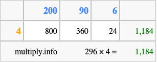 Below is an illustration showing you how to calculate 296 times 4 using the box method, using the instructions above.