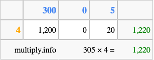 Below is an illustration showing you how to calculate 305 times 4 using the box method, using the instructions above.