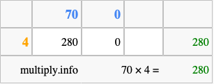 Below is an illustration showing you how to calculate 70 times 4 using the box method, using the instructions above.