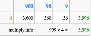 That's all there is to it! As you can see from the box above, the answer to 999 times 4 using the box method is 3,996.