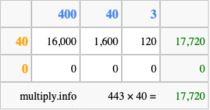 Finally, we add up all the sums we found in step 3 to get our final answer to 443 times 40.
