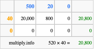 Below is an illustration showing you how to calculate 520 times 40 using the box method, using the instructions above.