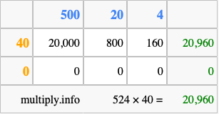 That's all there is to it! As you can see from the box above, the answer to 524 times 40 using the box method is 20,960.