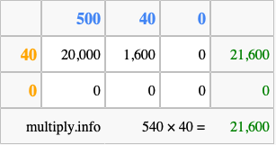 Below is an illustration showing you how to calculate 540 times 40 using the box method, using the instructions above.