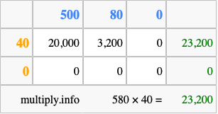 Below is an illustration showing you how to calculate 580 times 40 using the box method, using the instructions above.