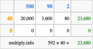 Below is an illustration showing you how to calculate 592 times 40 using the box method, using the instructions above.