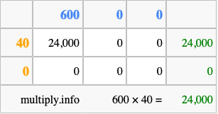 That's all there is to it! As you can see from the box above, the answer to 600 times 40 using the box method is 24,000.