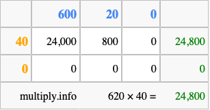 Below is an illustration showing you how to calculate 620 times 40 using the box method, using the instructions above.