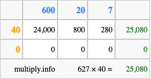 That's all there is to it! As you can see from the box above, the answer to 627 times 40 using the box method is 25,080.