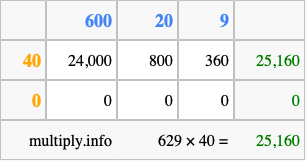 That's all there is to it! As you can see from the box above, the answer to 629 times 40 using the box method is 25,160.