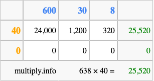 That's all there is to it! As you can see from the box above, the answer to 638 times 40 using the box method is 25,520.