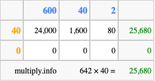 That's all there is to it! As you can see from the box above, the answer to 642 times 40 using the box method is 25,680.