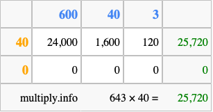Finally, we add up all the sums we found in step 3 to get our final answer to 643 times 40.