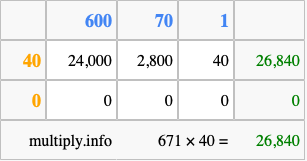 Below is an illustration showing you how to calculate 671 times 40 using the box method, using the instructions above.