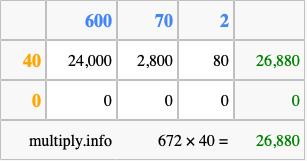 That's all there is to it! As you can see from the box above, the answer to 672 times 40 using the box method is 26,880.