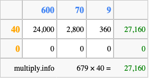 That's all there is to it! As you can see from the box above, the answer to 679 times 40 using the box method is 27,160.
