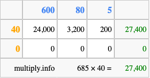Finally, we add up all the sums we found in step 3 to get our final answer to 685 times 40.