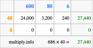 That's all there is to it! As you can see from the box above, the answer to 686 times 40 using the box method is 27,440.