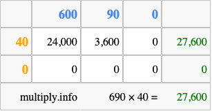 That's all there is to it! As you can see from the box above, the answer to 690 times 40 using the box method is 27,600.