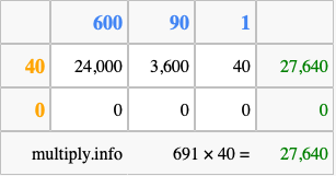 That's all there is to it! As you can see from the box above, the answer to 691 times 40 using the box method is 27,640.