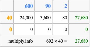 Below is an illustration showing you how to calculate 692 times 40 using the box method, using the instructions above.
