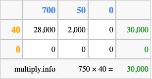 Finally, we add up all the sums we found in step 3 to get our final answer to 750 times 40.