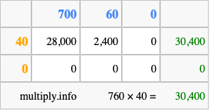 Below is an illustration showing you how to calculate 760 times 40 using the box method, using the instructions above.