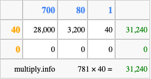 Finally, we add up all the sums we found in step 3 to get our final answer to 781 times 40.