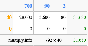 That's all there is to it! As you can see from the box above, the answer to 792 times 40 using the box method is 31,680.