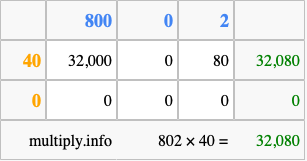 That's all there is to it! As you can see from the box above, the answer to 802 times 40 using the box method is 32,080.